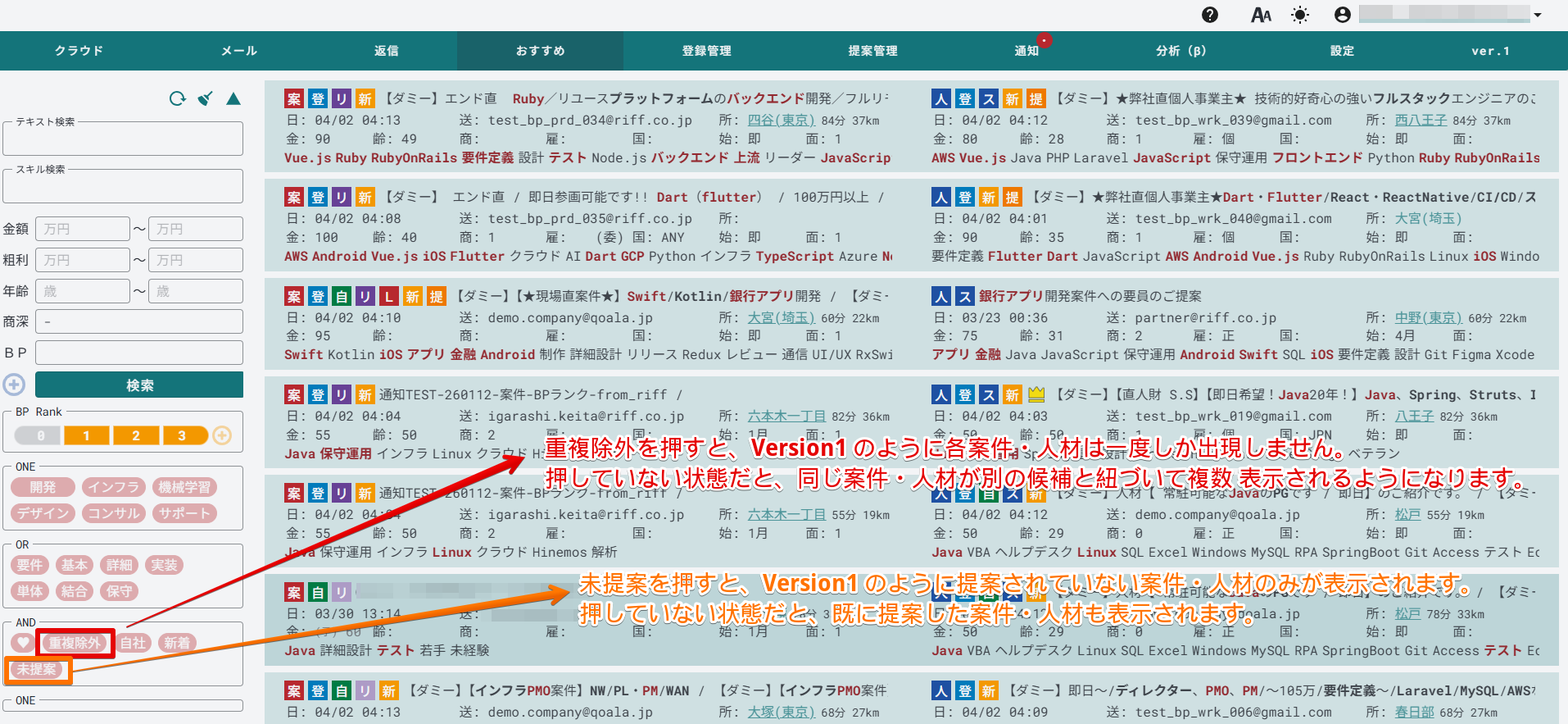■ Version1 のおすすめでは、同じ案件・人材は一度しか出現しないようになっていました。
