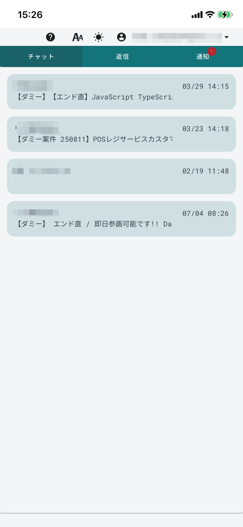 以下はチャット画面の例です。件名をクリックし、スマホから返信を行うことができます。