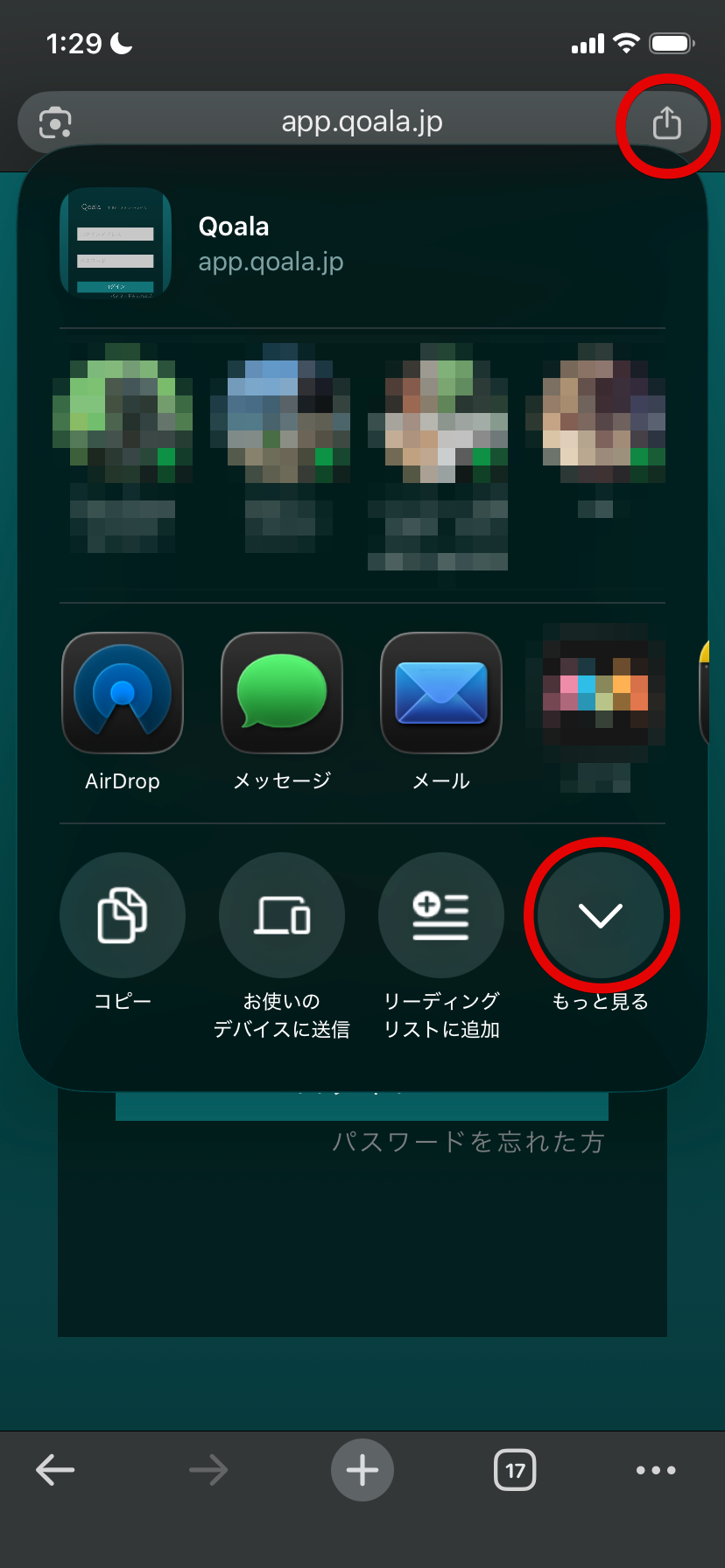 2. URLバーの右端にある共有ボタンをクリックし、表示されるメニュー内の「もっと見る」をクリックしてください(画像は iOS版Chromeの場合)