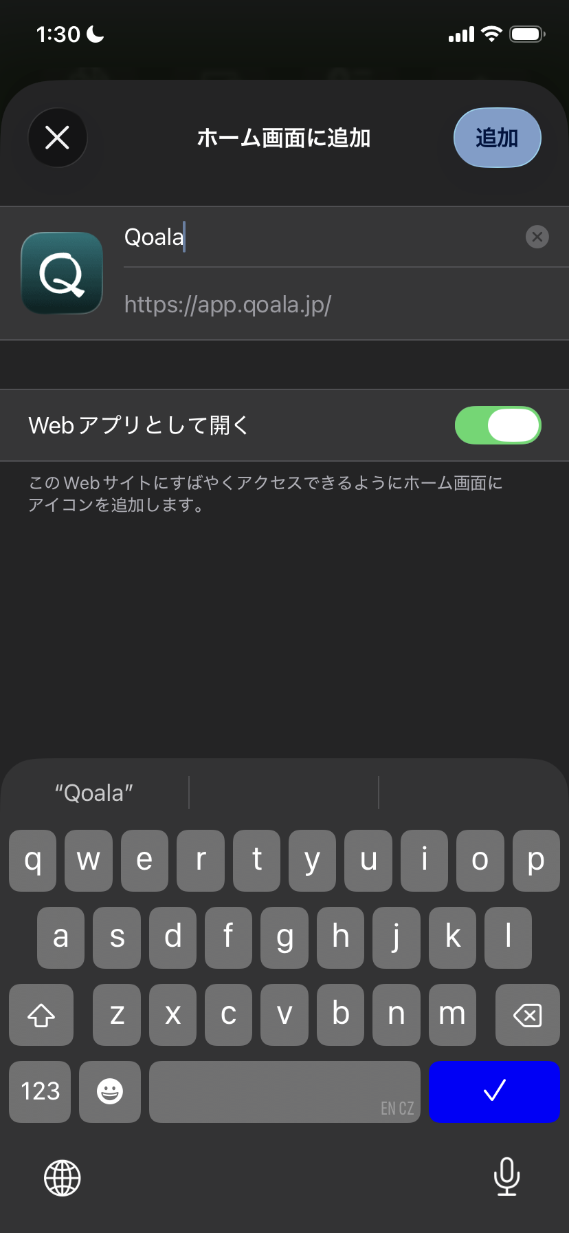4. 「Webアプリとして開く」をONにして、「追加」をクリックしてください